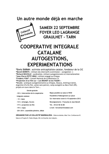 Le 22 septembre 2012, il récidive en organisant une journée sur les coopératives, l'autogestion, les expérimentations alternatives... Nous y parlerons de la Coopérative Intégrale Catalane, d'organisation sociale au Chiapas (Mexique), d'une entreprise autogérée au Pays Basque sud (Fagor), d'entreprises récupérées et autogérées en Argentine et en Amérique du sud et d'expérimentations plus locales. . .