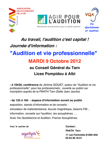 organisé par FNATH du Tarn avec Vie quotidienne et audition, France acouphènes, soutenue par AGIR POUR L'AUDITION, l'Agefiph