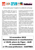 Les organisations syndicales CFDT, CGT, FSU, Solidaires, Unsa décident de faire du 14 novembre une grande journée de mobilisation interprofessionnelle rassemblant les salariés du privé et du public, les retraités et les chômeurs pour manifester leur volonté de voir apporter des réponses concrètes aux difficultés que vivent tous les travailleurs en France et en Europe, en solidarité avec les travailleurs espagnols, portugais et grecs.