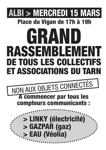 Une rassemblement national est prévue le 22 mars à Paris de 11h30 à 15h devant la maison de Radio France (116 AV du Pot Kennedy) . Il s'agit d'une action stopLinky et autres compteurs communicants.