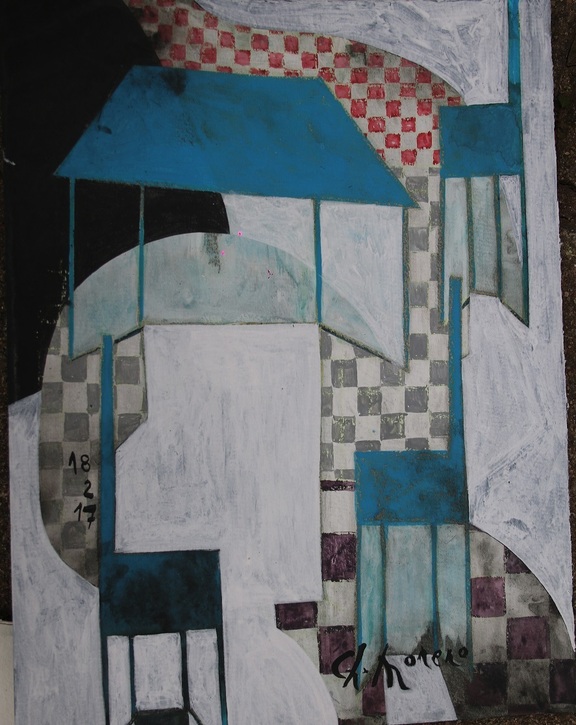 Quatre pieds bleus, élégants et très fins, délicatement posés sur les carreaux de l'entrée, siègent.
