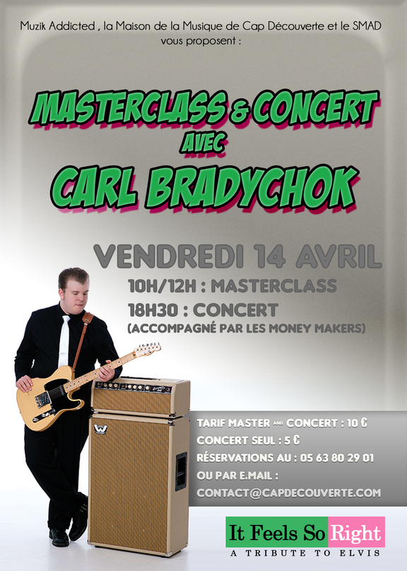 L'Ecole de Muzik Addicted et l'équipe de la Maison de la Musique (SMAD) accueilleront en exclusivité le guitariste Carl Bradychok, le Vendredi 14 avril à de 10h00 à 12h00, à la Maison de la Musique, dans le cadre d'une Master Class Guitare.