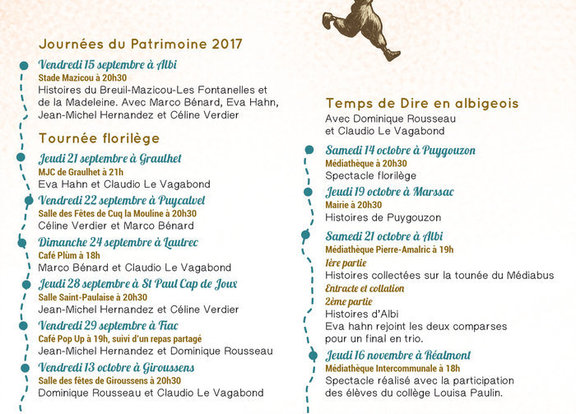 Après une escale albigeoise en juin, le Temps de Dire retrouve ses couleurs d'automne pour de nombreux événements qui s'étaleront du 15 septembre au 16 novembre. Tout d'abord, une restitution des collectages de juin ouvrira les Journées du patrimoine à Albi, le 15 septembre, avec les histoires des quartiers de la Madeleine et du Breuil-Mazicou-Les Fontanelles. Cette année, RaconTarn organise aussi une « tournée florilège » permettant aux conteurs et conteuses de se retrouver en duo afin de faire partager au public les histoires qui les ont le plus touchés, le plus marqués depuis le début du Temps de Dire. Cette tournée passera par Graulhet (21/9), Cuq Vielmur (22/9), Lautrec (24/9), Saint-Paul-Cap-de-Joux (28/9), Fiac (29/9) et Giroussens (13/10).