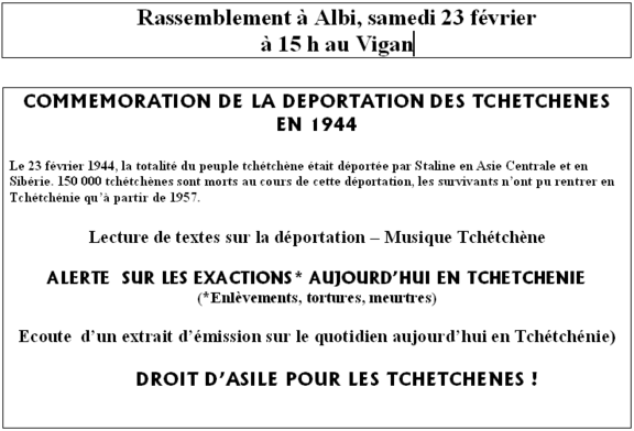 Soutien : chèques à l'ordre de MRAP/Tchétchénie, adresse : Mrap/Tchétchénie,