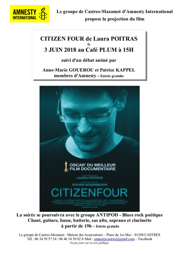 Projection du film "Citizen Four" de Laura Poitras. Cette séance sera suivie d'un débat animé par Anne-Marie GOUEROU et Patrice Kappel, membres d'Amnesty.